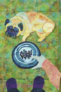 Once I had my working photos, I fuse-collaged the dog, the bowl and my hand, and my slippers. Next: choosing a background. Hmmm. Let us just say I tried MANY colors. If a color contrasted with the warm tones, the blues/purples blended in. If the color contrasted with the purple and blues, the pug got lost. Some prints were blah. Some were too visually busy.