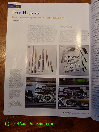 Especially in my house! Think rural. Think cats. Think Sarah. But you don’t want dust inside your sewing machine! I was so happy when editor Kit Robinson asked me to do an article on the care and feeding of your domestic sewing machine. That article has just come out in the March/April issue of Machine Quilting Unlimited: