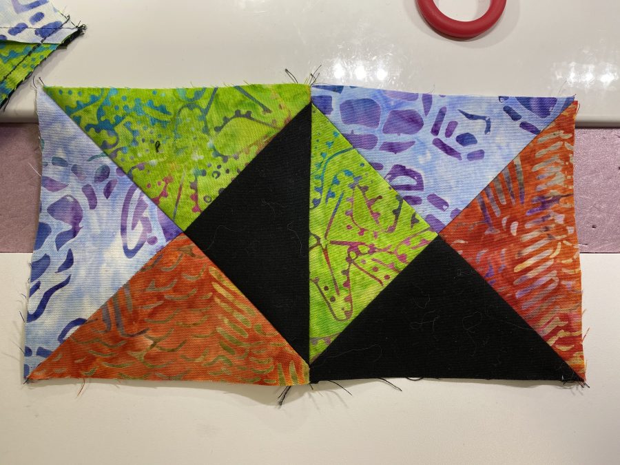 First, of course, you need to cut your fabrics. I used a hybrid method using the AccuQuiltGo! for everything except the large black triangles on the border. First, let me show you how fast it went cutting the components on my AccuQuiltGO! in this video. The video isn’t perfect–I’m improving in my editing skills. I need to mark what is within camera view though! Next video will be even better…I’m learning! When I was playing, it stopped a couple times so just click play again to continue–keep an eye on where the progress bar is. Dunno what’s up with that…another learning curve LOL!