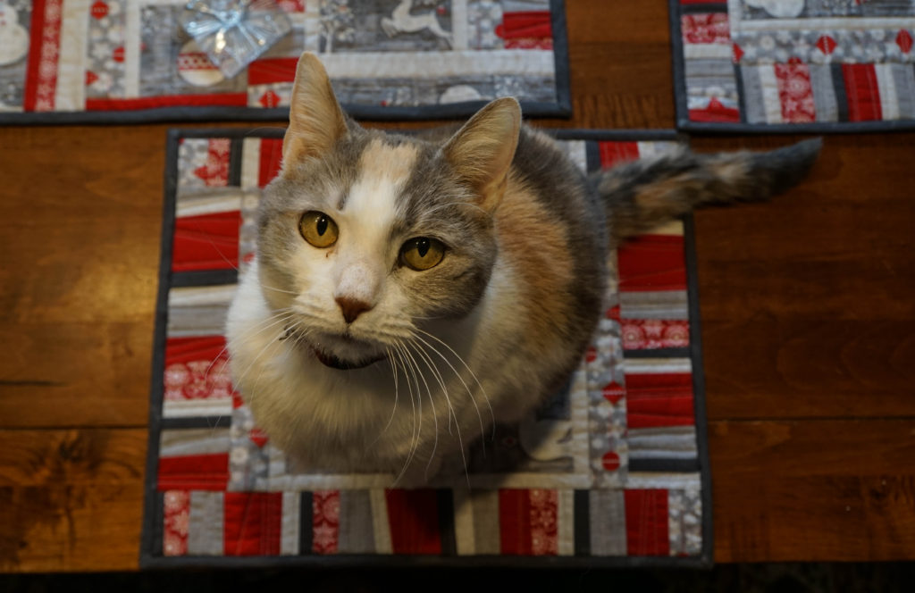 Wednesday, December 7th, 2016Last December at our local Coastal Quilters Christmas/Holiday meeting, we had a little game where you each bring a giftie, and end up with a different giftie. I ended up with a lovely set of fat quarters in very “Quilt Modern” colors: the red, white and gray winter themed ones. I decided to add some new winter placemats and table runner made from the theme fabric using improvisational piecing. You can find the pattern at Janome America’s blog, here.