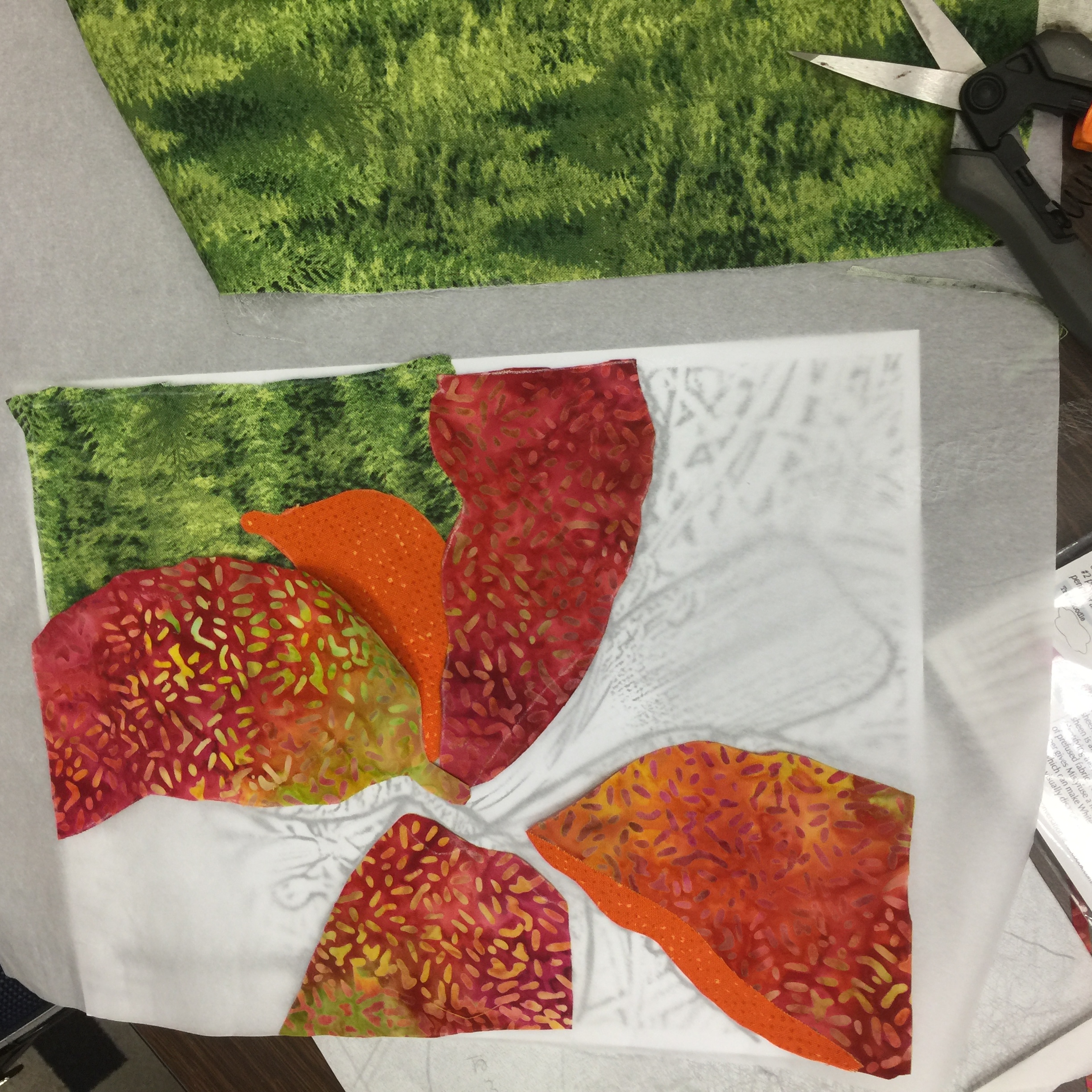 Love how Cathryn Sullivan of Pipe Creek, TX, cut the ridge line with the shape of trees–her ridge is closer to the viewer than the hills in my quilts. See below for this quilt as she worked on it more.