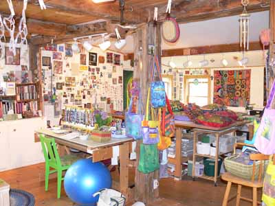 For those of you who have come to art quilting lately, Natasha was one of the trail blazers, and has been at the forefront of the art quilt movement for longer than she probably wants to remember (and it also means she started young!). Here’s her website…I encourage you to go look and enjoy (and shop?). Anyway, there was plenty of color and creativity in her home… both in her studio and in the other rooms. Here’s Natasha with one of her works in progress…she began with white cloth, used lots of Shiva paintsticks and more: