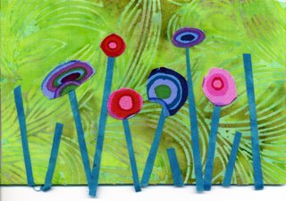 First, I talked about the supplies one uses. There are several great tutorials on the internet, including here at Deb R’s blog, at Kathie Briggs‘ blog, and Pamela Allen’s. I decided that for my class, I needed teaching samples, showing progress from blank stabilizer to finished card. Here’s the first of two “sequences”: