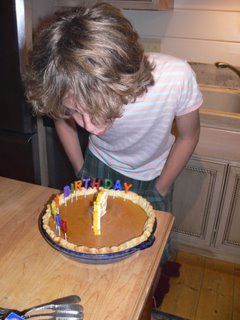And he was thrilled with his gifts from the three of us: three classic rock CD’s including Pink Floyd’s The Wall, Led Zeppelin IV, and a Van Halen CD that Eli knew Joshua wanted. Way cool! And this evening, we celebrated the fact that he doesn’t feel sick any more with his favorite thing for his birthday: pumpkin pie!