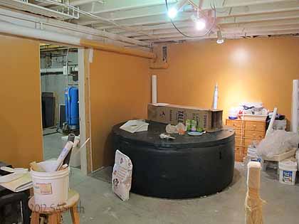 And part of the area on the right, with that icky-for-a-basement pumpkin and the large green hot tub. A hot tub in a basement area with NO windows? Getting it out was almost impossible–they must have taken it down before finishing the stairs–it was like popping a cork out a small hole, except the “hole” was the entire staircase up, and required removing door trim etc. to get the extra inch needed to get it out without cutting it into parts….