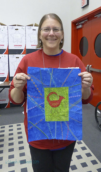 I teach that section as a class which was offered this year at Quilt Festival. This year I came up with a couple new projects as class options for students. Most of the students did the usual tossed leaves project for this class, but one loved my Funky Chicken. Here she is early in the day, filling the background with fun stitch combinations in fun colors: