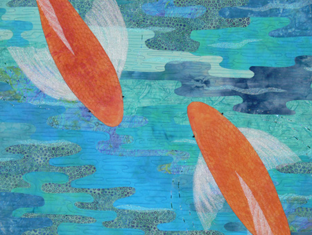 I’m thrilled to report that my art quilt Koi has been juried into Paducah and, provided the USPS has gotten it there, is already in that city waiting to be hung for the show! Long-time readers will remember this quilt, which is actually two-sided. I used quite a lot of my own hand-dyed fabric for this quilt, as well as commercial batiks. This is the front (looking down on the pond):
